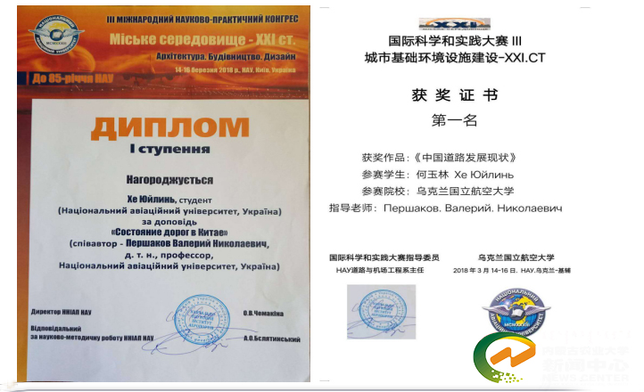 3月14-16日,在以“国际科学与实践大赛III——城市基础环境设施建设XXI”为主题的第三届乌克兰国际科学与实践大赛中,何玉林的参赛作品《中国道路发展现状》从入围的120件作品中脱颖而出,获得了第一名。